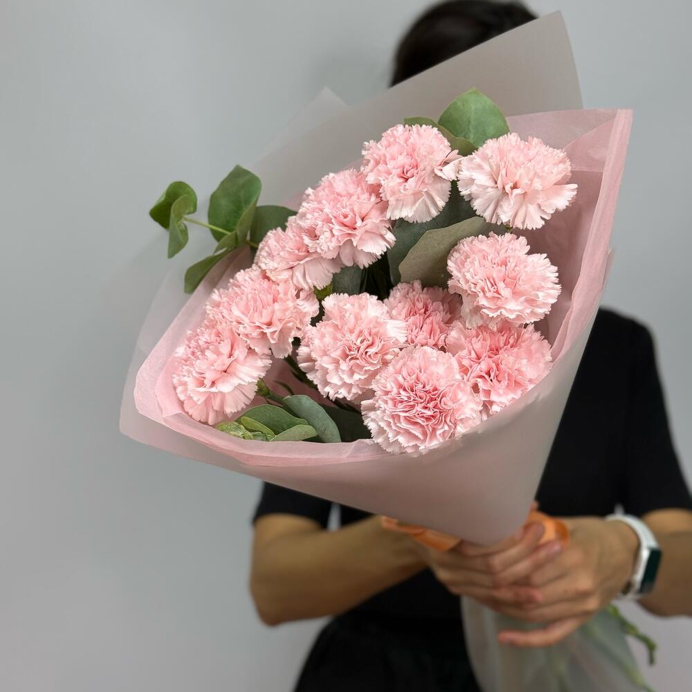 Эвкалипт - 3 шт. Лента атласная - 1 шт. Тишью - 1 шт. Диантус - 11 шт. Упаковка дизайнерская - 1 шт. Кризал (подкормка) - 1 шт. рекомендация по уходу - 1 шт.